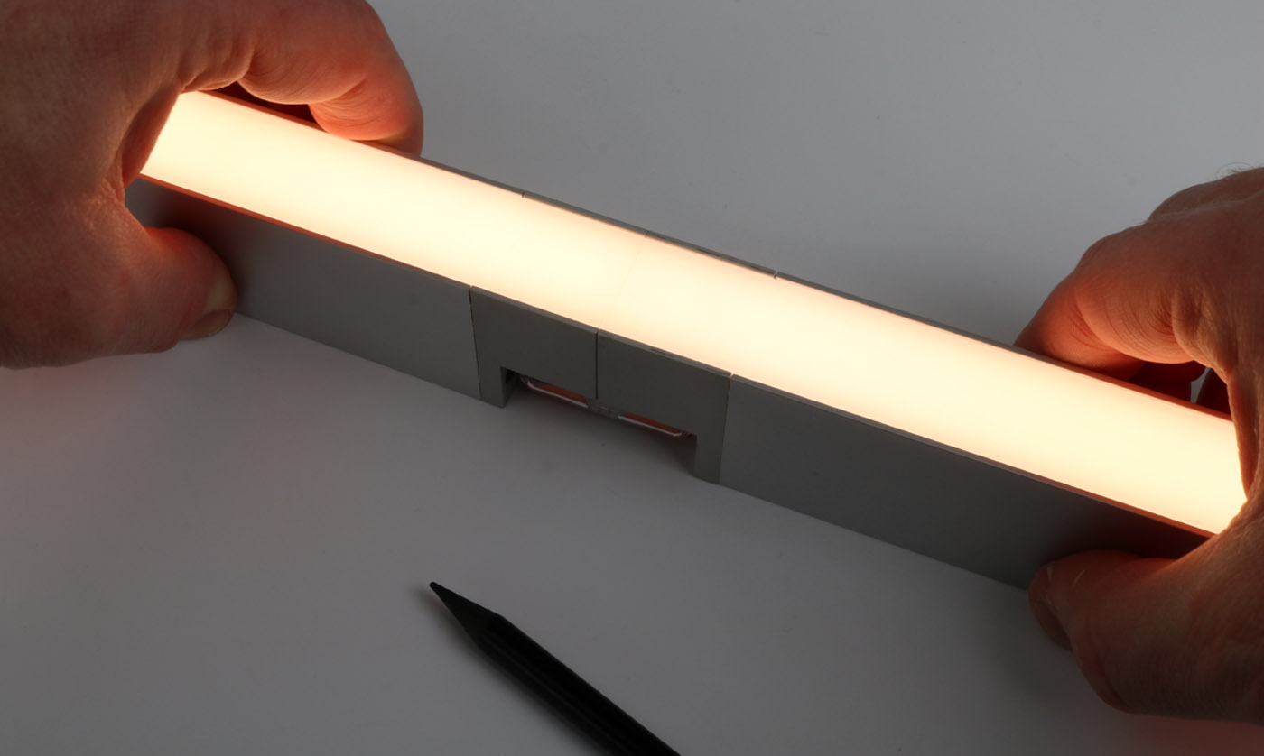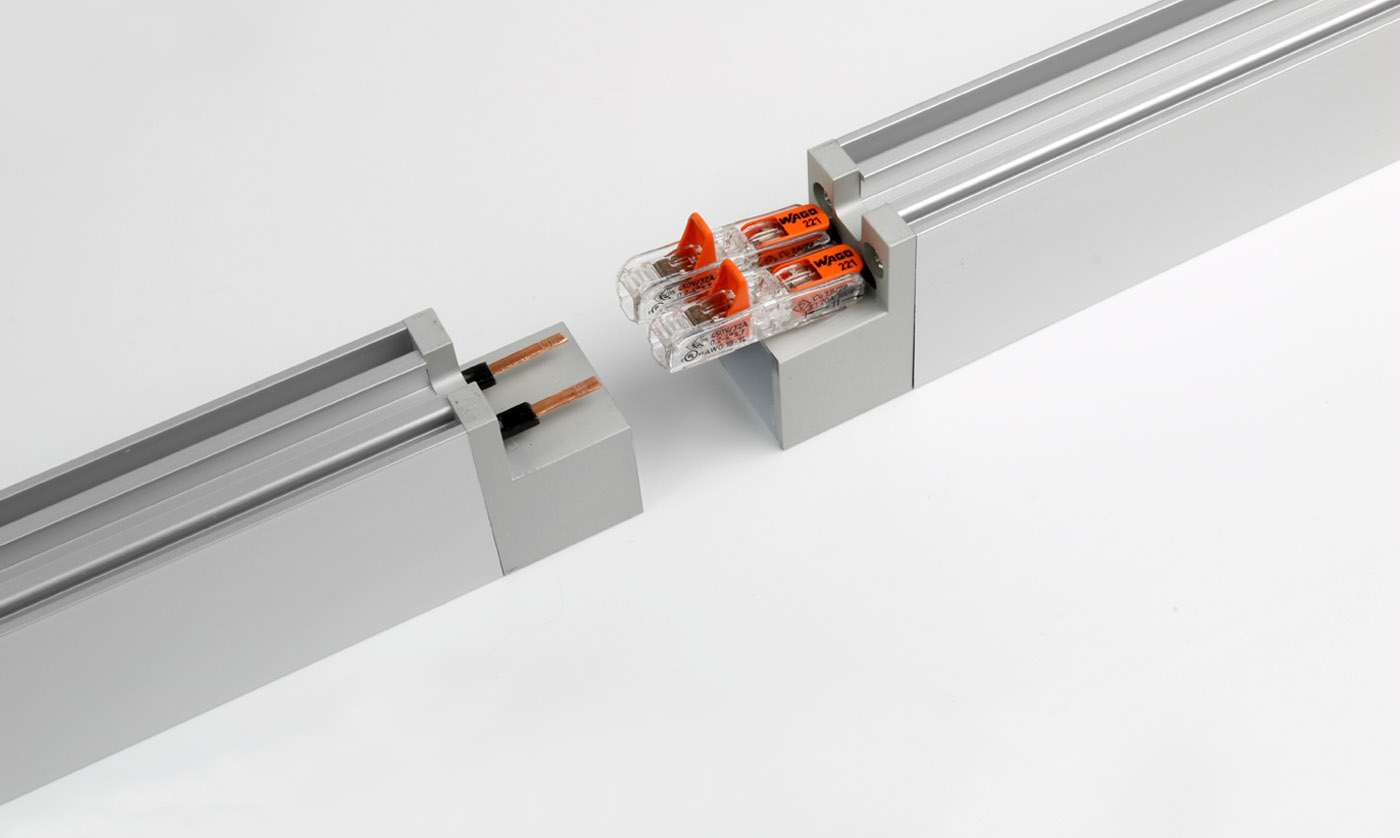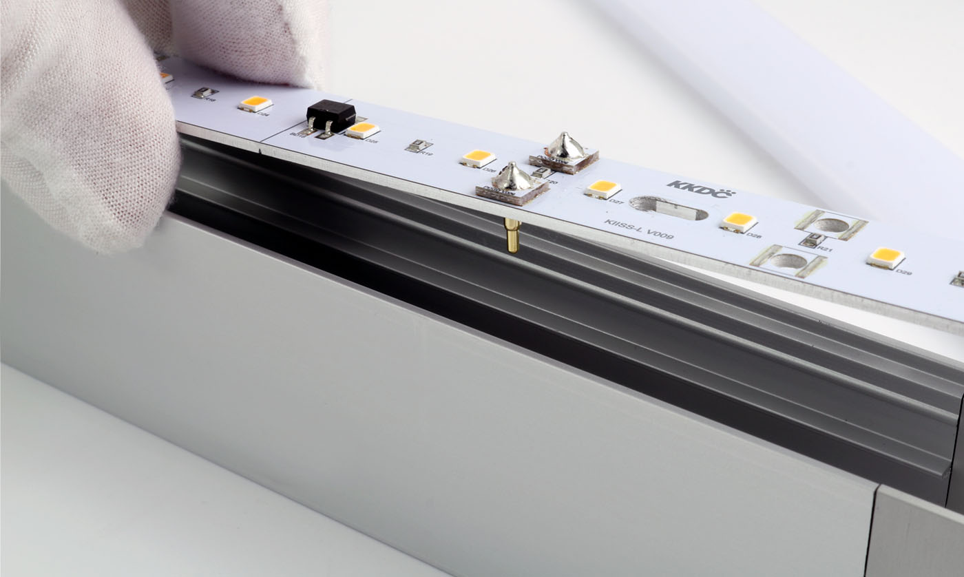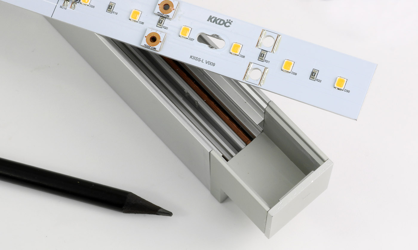 KIISS-L housing system uses a screw-fixed PCB design with spring loaded contact points to create long continuous light runs off a single 24V DC power feed. The no-polarity circuit design allows modules to be mixed for custom layouts with the easy removable nature of the LED light source compatible with the KKDC 'RE.VO' refurbishment scheme where upgradability and recyclability ensures a more future-proofed and ethical lighting installation.