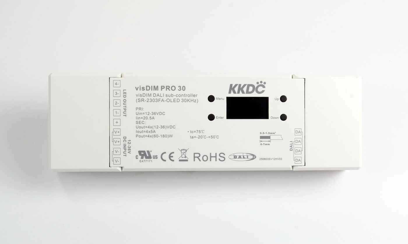 visDIM PRO 30 is our new 'media friendly' 30kHz PWM frequency DALI-2 dimming sub-controller designed to eliminate unwanted flickering effects that can potentially be picked up in some video recording devices and be noticeable in video playback. Compatible with a wide selection of KKDC LED strips, please look out for the new visDIM PRO green tick icon throughout our product specs and speak to your local KKDC branch for more information.